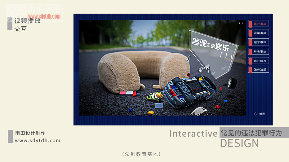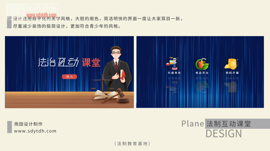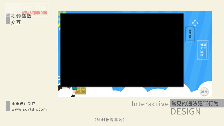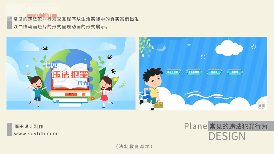 3.常见的违法犯罪行为交互程序从生活实际中的真实案例出发,以二 维动画短片的形式呈现动画的形式展示,并且配以法律解读通过对案件进行分析,做到懂法、守法、爱法,并能运用法律来保护自己的权益不受侵害。