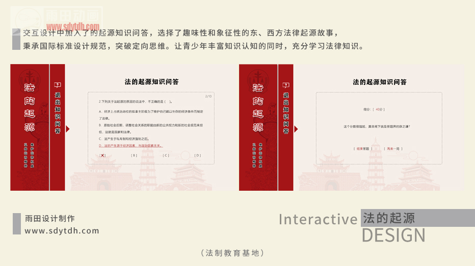 2.法的起源交互程序通过展示以东/西方法律起源与发展为内容依托, 选择具有趣味性和象征性的典故故事或事件,以互动探究的方式引导青少年带着好 奇心探究东/西方的法理缘起、法理精神、 发展历史和文化。丰富知识认知的同时, 程序中还加入了法的起源知识问答,充分学习法律知识。