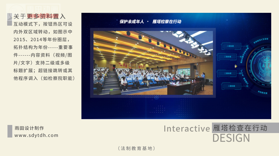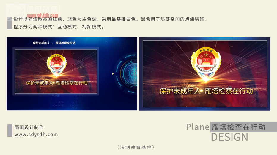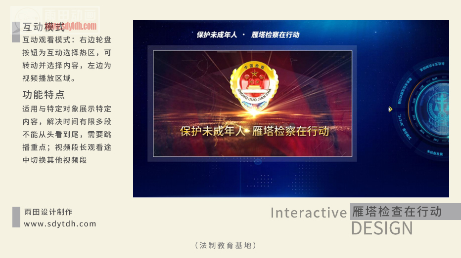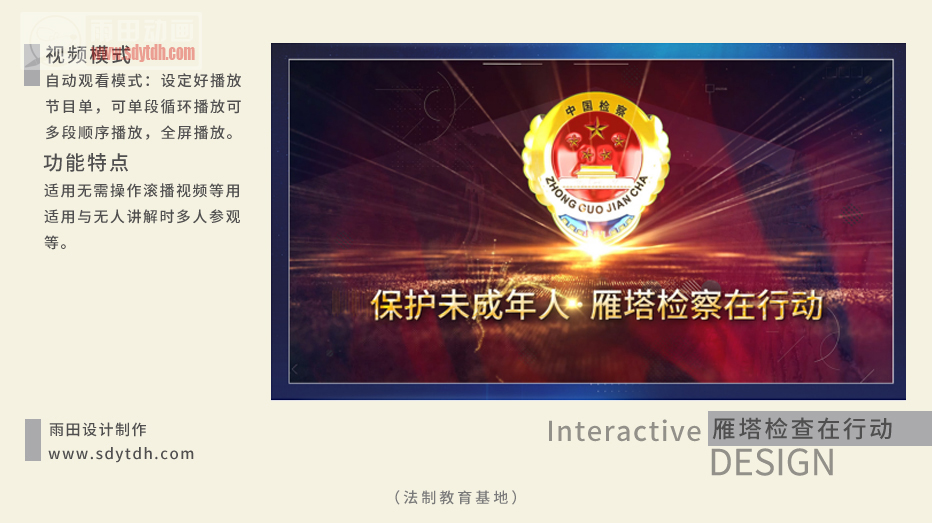 5.雁塔检查在行动交互程序采用了人机交互技术,程序分为两种模式一种为视频模式另一种为交互模式,通过宣传视频、图文交互的方式来展现:聚焦未检发展时间轴线,聚焦“3+3+N未成年人社会矫治“雁塔模 式”、构建未成年检察五大机制体系和未 成年检察新发展等内容,以图文科普、短 视频等方式,综合呈现近三年来的工作理念、工作中心的转变和主要工作内容。其两种模式的功能特点——交互模式:适用与特定对象展示特定内容,从客户角度出发解决时间有限不能从头看到尾,需要调播重点也适用于中间切换。视频模式:适用于无需操作滚播视频等,适用于无人讲解时多人参观。